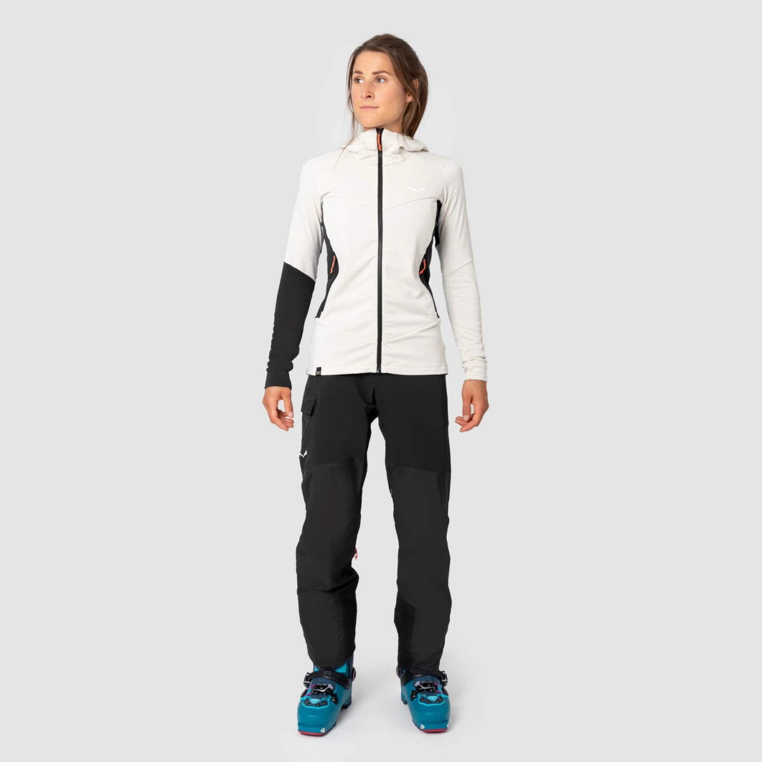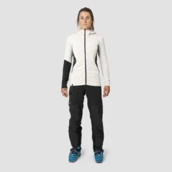 Other features, such as the two zippered side pockets that hold small items and the fitted hood, make the women’s Sella Merino Hooded Jacket the ideal midlayer for ski touring.