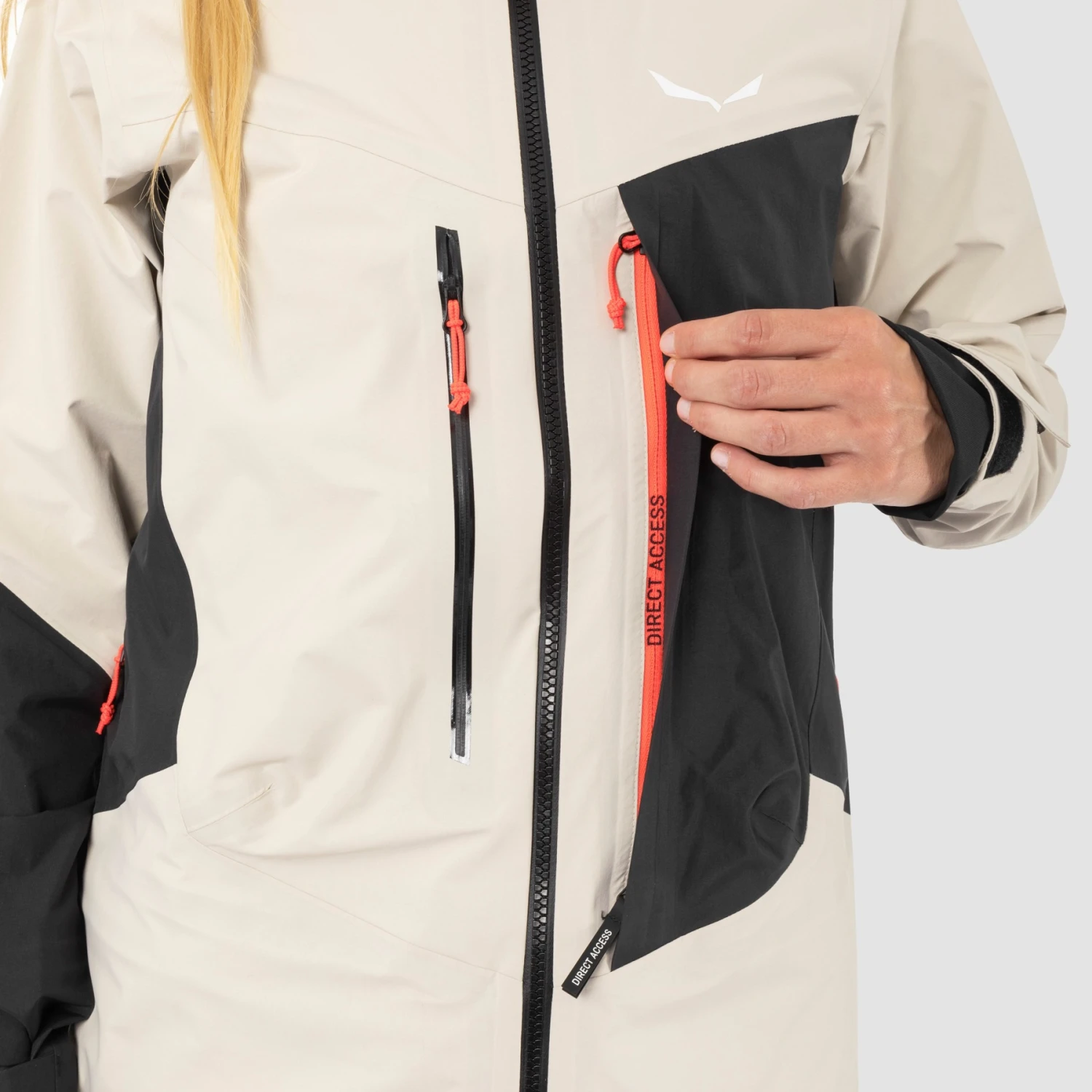 With features such as the helmet-compatible hood with optional volume expansion via the zipper and storm visor, as well as the Direct Access chest pocket, the hardshell was designed specifically for alpine pursuits in winter. The chest pocket with innovative Direct-Access zipper with double slider allows quick and easy access to your avalanche transceiver or the layers underneath.