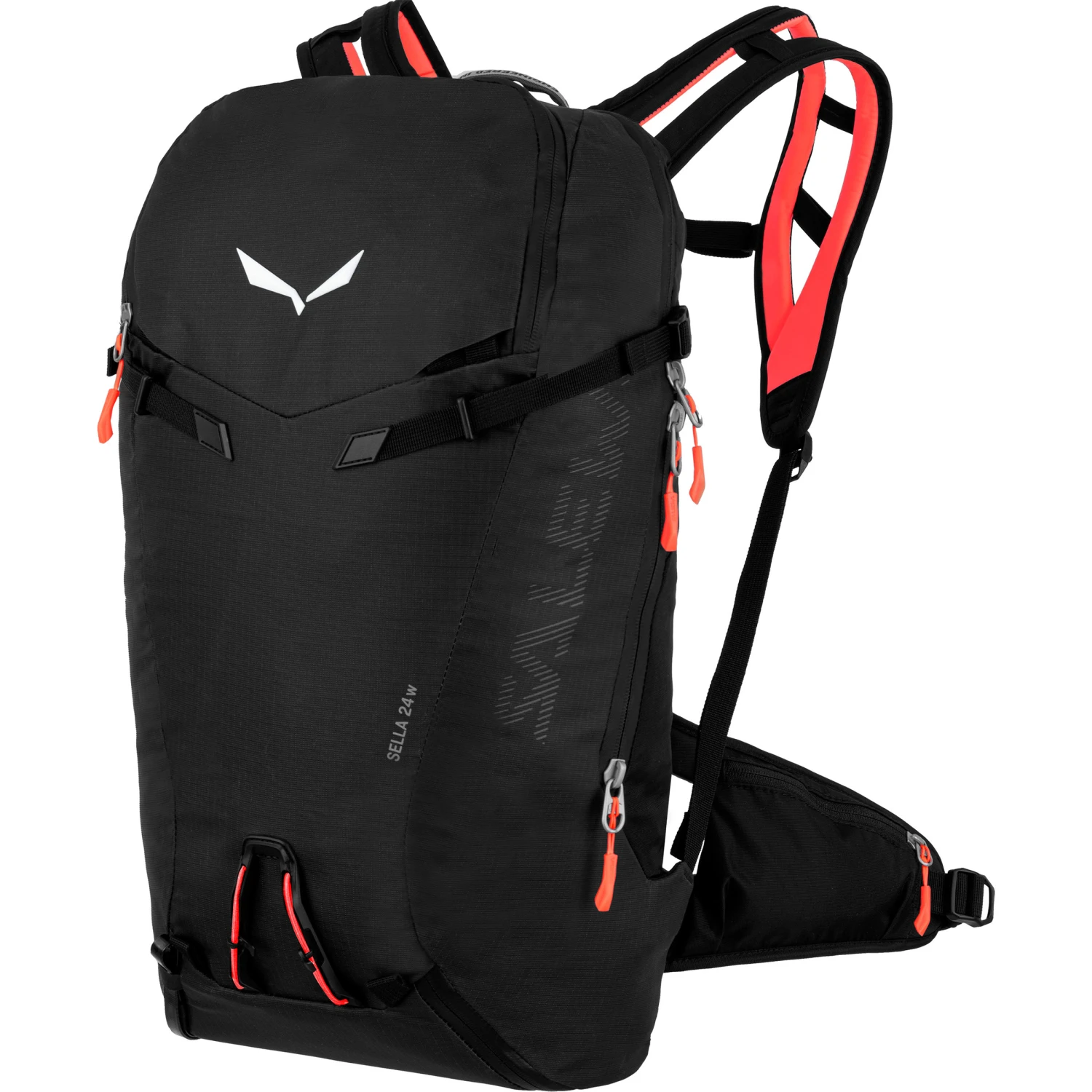 <p>The Salewa Sella 24 ski backpack is designed for adventurous day tours. The numerous attachment options give you plenty of space for equipment, while the interior comfortably holds your food and extra gear.</p><p>The backpack has a ventilated contact back system that gives you the advantage of a snug-fitting backpack and, at the same time, is good at dissipating stowage heat. The split shoulder and hip straps are also designed to keep sweat from building up underneath them, keeping you dry and warm. The split shoulder and hip straps are also nice and wide, distributing the weight well across the pelvis and shoulders. Compression straps on the side allow you to adjust the backpack’s volume to your luggage.</p><p>This backpack has everything you want, from a ski touring backpack. In addition to the obligatory ski and pole attachment, you will find a pocket inside for your avalanche equipment, numerous other attachment options on the outside and the possibility to retrofit a hydration system. </p><p>To ensure that you don’t have to fear rock contact on demanding routes, the Sella 24 ski backpack is made from highly robust material and can easily withstand rock contact. </p>